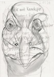 Mein erster Arbeitstag steht bevor. Der Weg führt in ein steriles Bürogebäude. Die Zeit zieht an, von allen Seiten. Im Moment befinde ich mich mit meinem Strickzeug noch auf einer kleinen Insel, auf der Bäume wachsen, inmitten eines Biotops aus Wiesen, Feldern und kleinen Wäldern, und ich weiß nicht, warum. Ich trage eine dünne hellgraue Stoffhose und eine knappe Bluse – Stoff, Falten, Blick in Stoff. Eilig verlasse ich nun die Insel in der Hoffnung, dass es nicht auffällt, und deponiere meine Wolle am Fahrrad, ohne zu wissen, ob das stimmt.